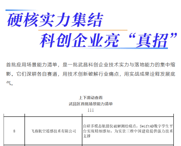 近日,飞燕航空遥感技术有限公司(以下简称“飞燕遥感”)凭借其卓越的“空天地一体化”技术实力,成功入选武汉市武昌区首批应用场景能力清单。